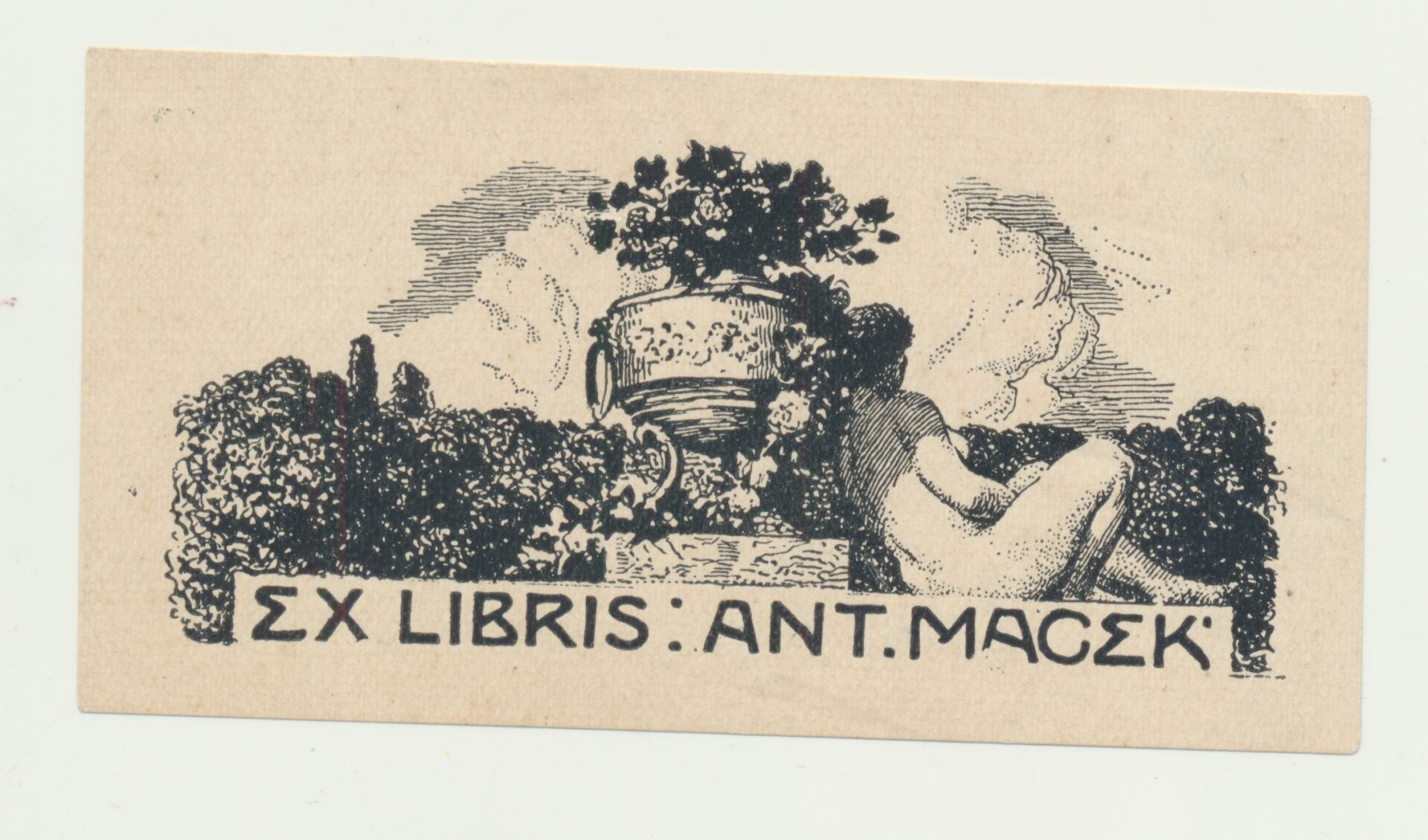 Vpravo se nachází ženský akt otočen zády a opírající se o velkou vázu s květinami. Sokl nese nápis EX LIBRIS: ANT. MACEK. (pozn. ed.)