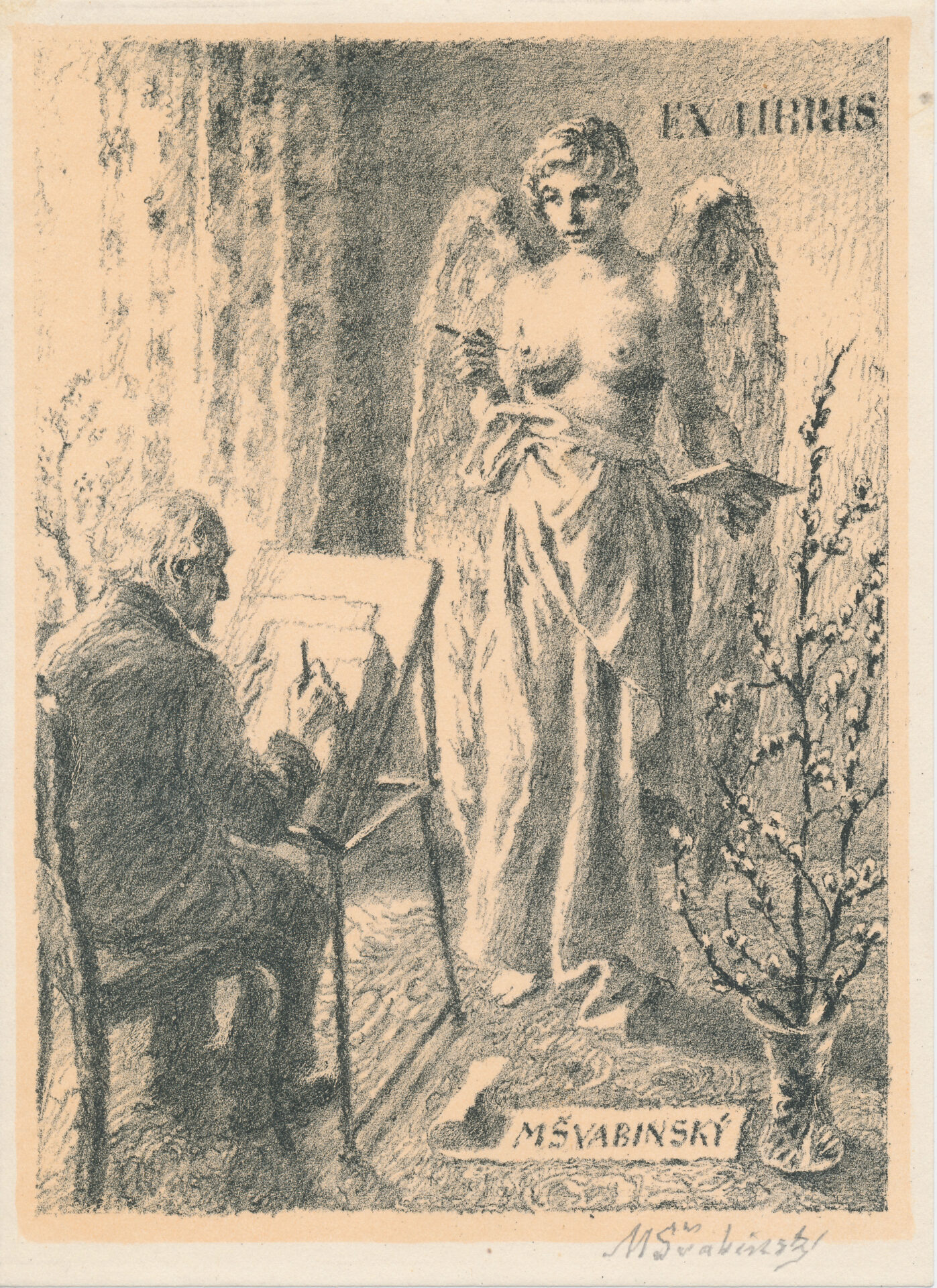 Popis: „V interiéru stojí poloobnažená alegorická ženská postava s velkými křídly – symbol malířovy inspirace. Před ní sedí u svého pracovního stojanu umělec s tužkou v ruce. Text je napsán verzálkami: nahoře vlevo EX LIBRIS, dole na stuze M ŠVABINSKÝ.“ [Páleníček – Švabinská 1976]