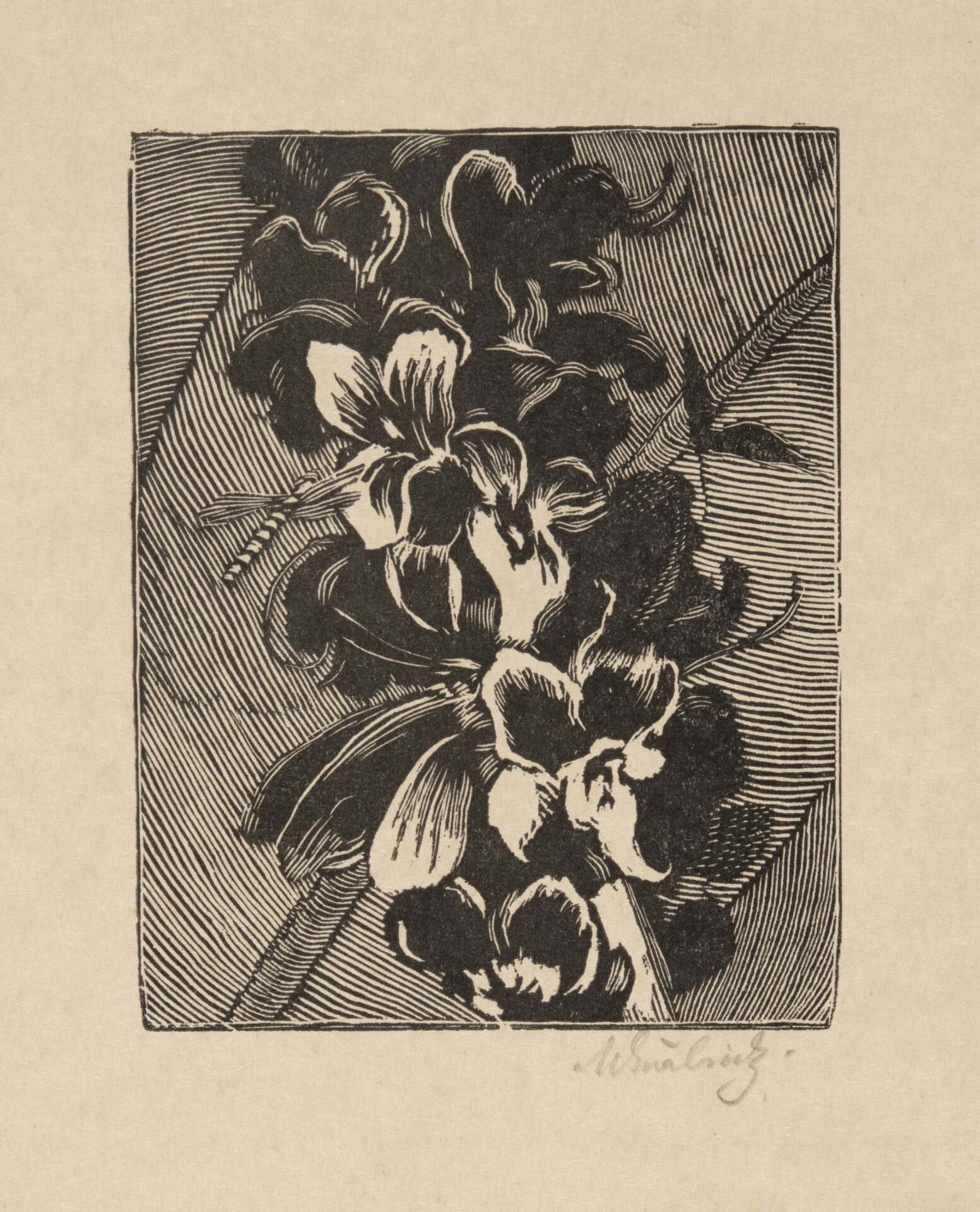 Historie: „Ještě v říjnu 1920 byla udělána před žáky na Akademii dřevorytem „FANTASTICKÁ KVĚTINA“, motýlokvětá, plnící celý list, s motýlem na ní sedícím a s vážkami ji obletujícími. Zajímá, že umělec tu zkoušel dřevoryt tónový. Grafický ten list vyšel jako příloha „Moderní Revue“.“ [Žákavec 1936, s. 188]