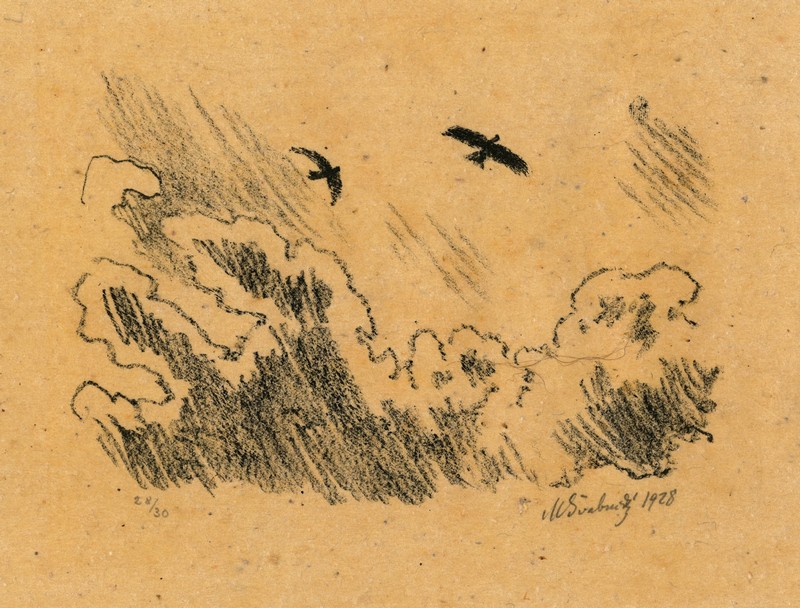 Oblaka proti slunci; v největším světle dvě létající lesní káňata. Motiv ze Sobětuch.