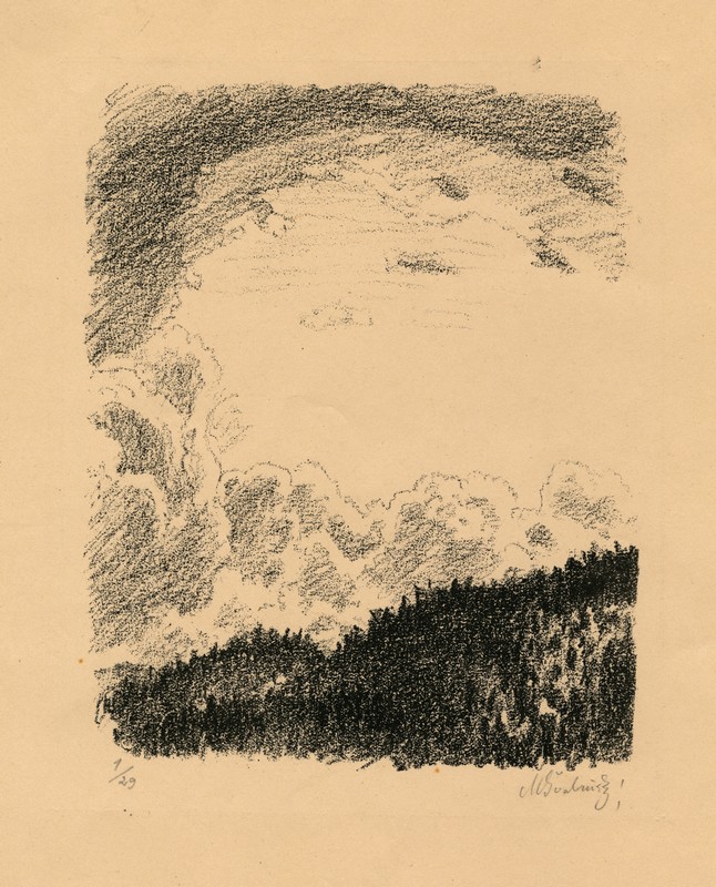 Popis: „V dolní části listu od leva do prava stoupající vrcholky dvou lesy porostlých kopců. Na obloze, v polokruhu napravo otevřeném, jsou nakupeny mraky, v dolní části kumulovité a světlé, horní část zabírá mrak tmavší. Uvnitř mrakového kruhu bílý prostor oblohy s několika tmavšími mráčky.“ [Matějček 1933]