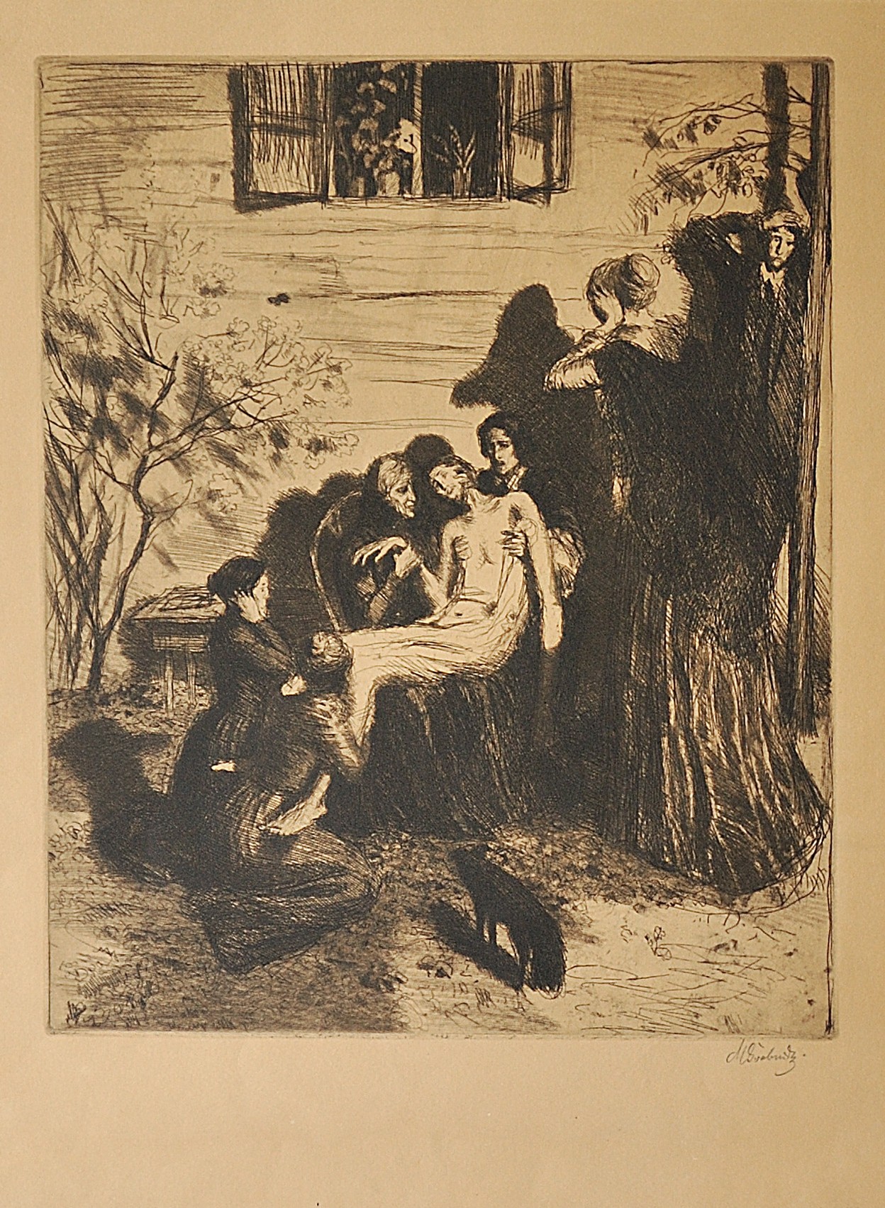 „V letech 1906 a 1907 pak vznikají dvě práce (obě hned v několika variantách), jež vtiskují nové zaměření do Švabinského spiritualismu, obohacujíce ho o několik nových rysů. Jsou to Pieta a Před snímáním z kříže. Jimi vstupuje Švabinského imaginace v oblast, inspirovanou náboženskými náměty, jež se později do jeho tvorby několikrát vrátí. Při tom to nejsou náboženské obrazy v pravém slova smyslu: náboženský námět je tu jen ideou, která přenáší do jiného, spirituálního světa příběh, inspirovaný zážitkem (jako je tomu v „Pietě“), nebo do současnosti přenesený (v leptech „Před snímáním z kříže“). Prostředí, do kterého Švabinský tyto výjevy vsadil, je vzato z nejbližšího okolí umělcova, „Pieta“ je dokonce tragickou obměnou „Náčrtu k rodinnému portrétu“, z něhož přejímá situování výjevu pod okno venkovské chalupy, postoje i charakteristiku některých postav. Onen tragický rys je další novum, s nímž se v tvorbě Švabinského setkáváme, rys, který zde po prvé zazní, avšak zároveň i dozní. Obě komposice jsou symbolickým výrazem bolesti, hrůzy a zděšení nad tragickou smrtí člověka, vyrvaného z kruhu rodiny, výjevy, naplněné tíživou atmosférou, jež je přenáší do jiného, nereálného světa. První, akvarelovaný náčrt k „Pietě“, a jednu variantu v leptu umístil Švabinský do rámce slunného podvečera, který v dlouhých stínech opakuje obrysy postav na stěně chalupy, pro dvě druhé leptané varianty tohoto námětu zvolil však hlubokou noc, v níž světlo lucerny ozařuje magickým světlem scénu, ponořenou v atmosféru duševní trýzně a bolesti. Rovněž výjev „Před snímáním z kříže“ provedl Švabinský leptem ve dvou variantách, umístiv jej před hluboké hvězdnaté nebe, s postavami přízrakovitě osvětlenými září ohně. Ani tento obraz není obrazem biblickým, třebaže je tu Kristus na kříži, nýbrž parafrází biblického námětu, přeneseného v jinou myšlenkovou oblast. Obě scény, ač v základě reálné, s postavami ze současnosti, jsou proniknuty spirituálními tendencemi, jež je z anekdotického příběhu povyšují v oblast symbolickou. Vlivy prerafaelistické už jsou zcela překonány, umělcova vůle o obrazové vyjádření duchovnosti jsoucna se projevuje novým obsahem i novou formou.“ [Loriš 1949, s. 62–64]