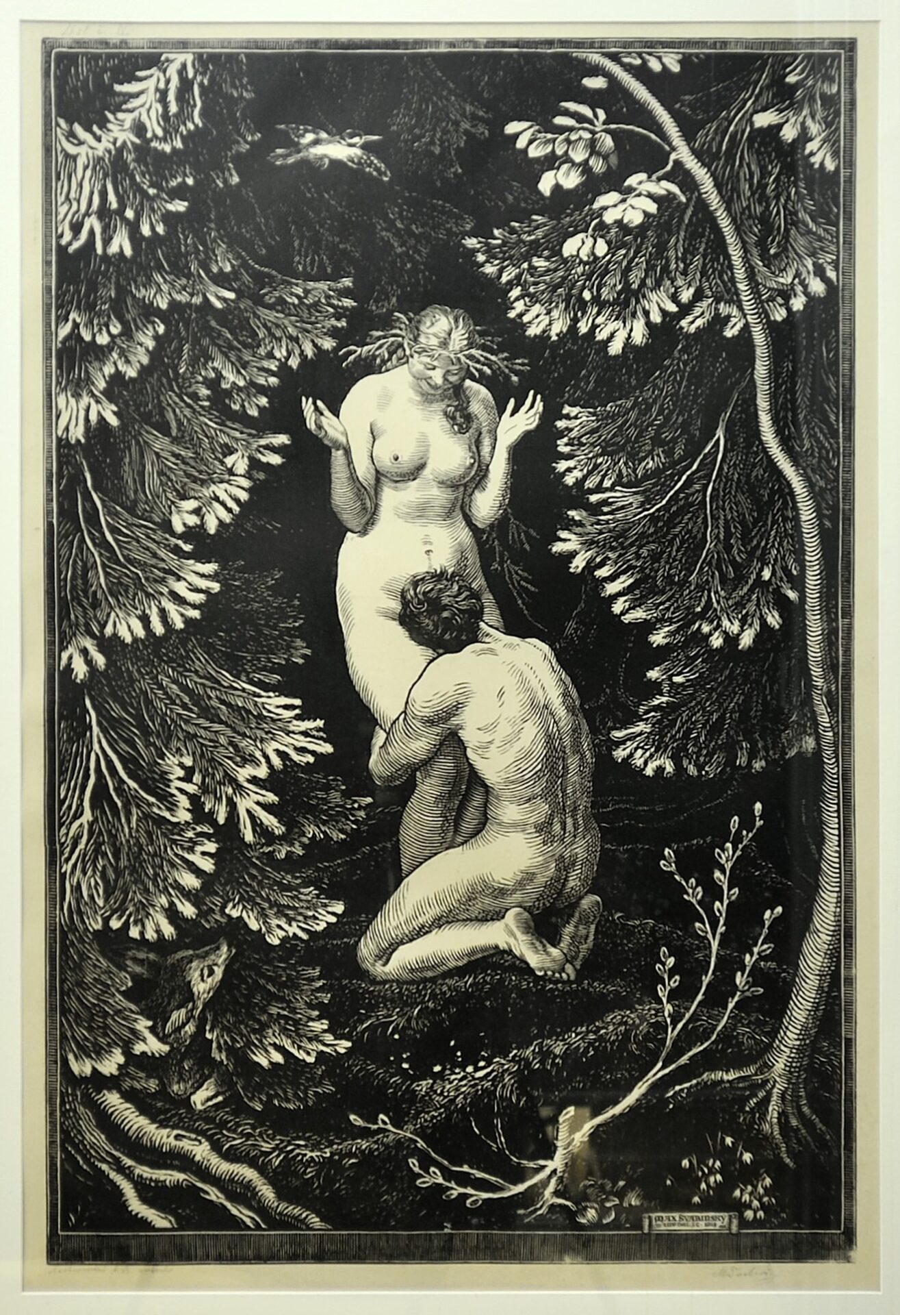 „…Počátkem první světové války do jeho díla vstupuje nová inspirace, která se zároveň stává druhou velkou láskou jeho života – paní Anna. Už koncem období s převažující exotickou inspirací se počíná měnit Švabinského představa ženské krásy. Tělesná křehkost Elina je v jeho výtvarných vizích stále častěji a naléhavěji nahrazována představou ženy plnějších forem a dlouhých nohou, které jako by plavným krokem nesly trup ženy, jež se malíři časem stala symbolem pudové plodivé síly Země. Proti Elinu období, které souznělo s dobovým sentimentem fin de siècle a libovalo si spíš v ztitěrnění, až v jakémsi zpoetičtění citových pout, prostupuje Annina období pudová síla mužství, hledajícího protipól své touhy. Pro malíře je štěstím, že tato jeho nová inspirace mu přináší tak hlubokou lidskou radostnost, že si intimitu svého poměru k Anně promítá do neskutečných poloh rájů a pralesů. Tak vzniká čtyřlistový cyklus dřevorytů Rajská sonáta i cyklus leptových inspirací V pralese. V těchto letech je Švabinský hedonikem okouzleným ženinou tělesností a hloubku svých prožitků promítá do milenecké dvojice, která v Rajské sonátě má tvář jeho i jeho milenky. Atmosféra milostnosti prostupuje téměř všechny jeho výtvarné záměry, v nichž mají místo i pohanské symboly divoženek, které letí nad lány polí, prohřátých poledním sluncem a provoněnými záhony obilných klasů, nebo pásy luk se schnoucím senem.“ [Páleníček 1970, s. 11–12]