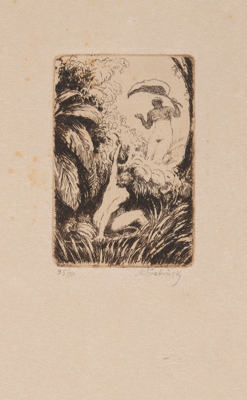 Historie: …Počátkem první světové války do jeho díla vstupuje nová inspirace, která se zároveň stává druhou velkou láskou jeho života – paní Anna. Už koncem období s převažující exotickou inspirací se počíná měnit Švabinského představa ženské krásy. Tělesná křehkost Elina je v jeho výtvarných vizích stále častěji a naléhavěji nahrazována představou ženy plnějších forem a dlouhých nohou, které jako by plavným krokem nesly trup ženy, jež se malíři časem stala symbolem pudové plodivé síly Země. Proti Elinu období, které souznělo s dobovým sentimentem fin de siècle a libovalo si spíš v ztitěrnění, až v jakémsi zpoetičtění citových pout, prostupuje Annina období pudová síla mužství, hledajícího protipól své touhy. Pro malíře je štěstím, že tato jeho nová inspirace mu přináší tak hlubokou lidskou radostnost, že si intimitu svého poměru k Anně promítá do neskutečných poloh rájů a pralesů. Tak vzniká čtyřlistový cyklus dřevorytů Rajská sonáta i cyklus leptových inspirací V pralese. V těchto letech je Švabinský hedonikem okouzleným ženinou tělesností a hloubku svých prožitků promítá do milenecké dvojice, která v Rajské sonátě má tvář jeho i jeho milenky. Atmosféra milostnosti prostupuje téměř všechny jeho výtvarné záměry, v nichž mají místo i pohanské symboly divoženek, které letí nad lány polí, prohřátých poledním sluncem a provoněnými záhony obilných klasů, nebo pásy luk se schnoucím senem.“ [Páleníček 1970, s. 11–12] „Prvním projevem citového vztahu k Anně bylo šest improvizací V pralese (1917)…Druhý list, Přivítání z lovu, spíš připomíná hold muže kráse ženy, stojící před ním v plné sluneční záři a jen hlavu si stínící banánovníkovým listem…V cyklu Švabinský graficky vypráví milostný příběh dvou lidí v dávné minulosti, kteří v pralese, v hlubokém osamocení, prožívají své vrcholné milostné štěstí. Jen typ ženy připomíná Annu.“ [Páleníček 1984, s. 101–103]
