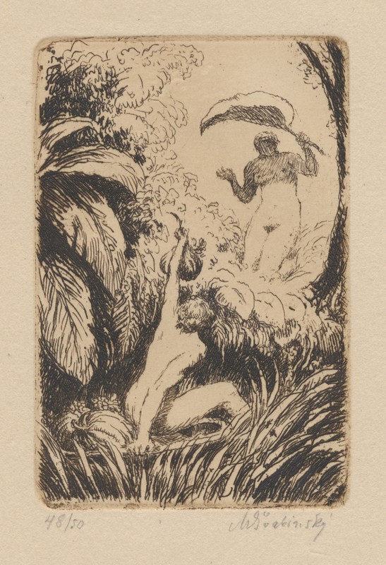 Historie: „…Počátkem první světové války do jeho díla vstupuje nová inspirace, která se zároveň stává druhou velkou láskou jeho života – paní Anna. Už koncem období s převažující exotickou inspirací se počíná měnit Švabinského představa ženské krásy. Tělesná křehkost Elina je v jeho výtvarných vizích stále častěji a naléhavěji nahrazována představou ženy plnějších forem a dlouhých nohou, které jako by plavným krokem nesly trup ženy, jež se malíři časem stala symbolem pudové plodivé síly Země. Proti Elinu období, které souznělo s dobovým sentimentem fin de siècle a libovalo si spíš v ztitěrnění, až v jakémsi zpoetičtění citových pout, prostupuje Annina období pudová síla mužství, hledajícího protipól své touhy. Pro malíře je štěstím, že tato jeho nová inspirace mu přináší tak hlubokou lidskou radostnost, že si intimitu svého poměru k Anně promítá do neskutečných poloh rájů a pralesů. Tak vzniká čtyřlistový cyklus dřevorytů Rajská sonáta i cyklus leptových inspirací V pralese. V těchto letech je Švabinský hedonikem okouzleným ženinou tělesností a hloubku svých prožitků promítá do milenecké dvojice, která v Rajské sonátě má tvář jeho i jeho milenky. Atmosféra milostnosti prostupuje téměř všechny jeho výtvarné záměry, v nichž mají místo i pohanské symboly divoženek, které letí nad lány polí, prohřátých poledním sluncem a provoněnými záhony obilných klasů, nebo pásy luk se schnoucím senem.“ [Páleníček 1970, s. 11–12]