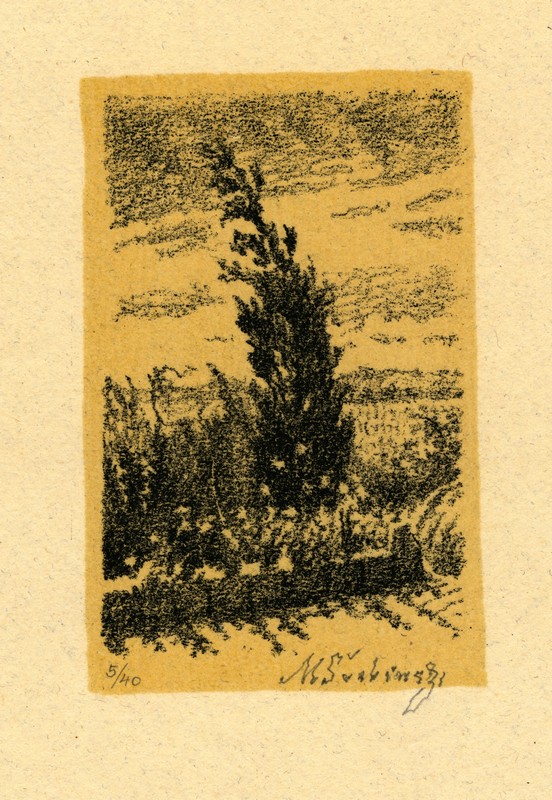Popis: Uprostřed listu doleva nakloněná túje, v popředí nízká kamenná zídka s květy, v pozadí výhled do rovinaté chodovské krajiny s protáhlými mraky.“ [Páleníček – Švabinská 1976]
