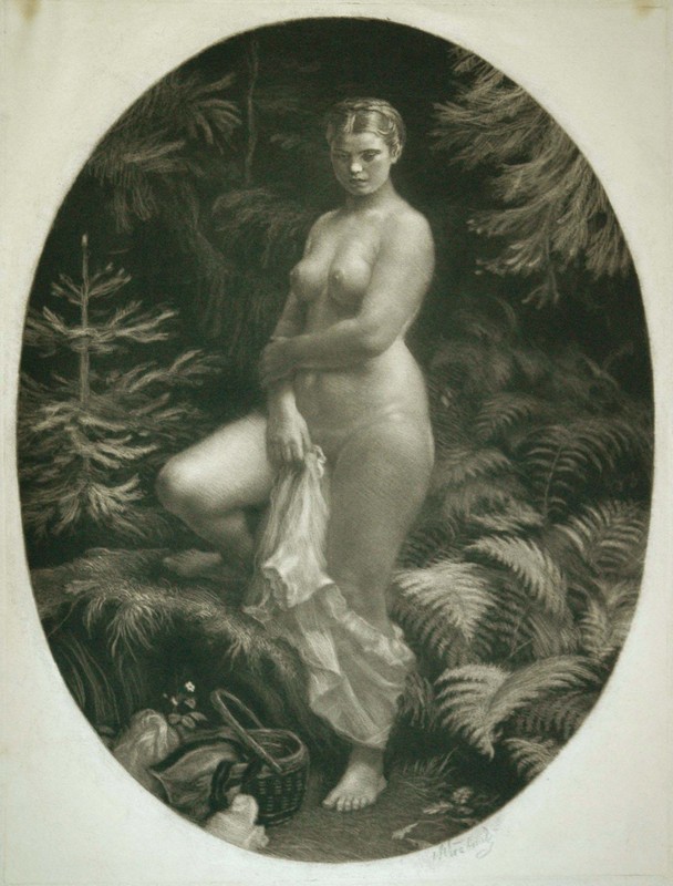 Popis: Nahá žena vyvinutých forem ze tří čtvrtin en face stojí v lese, ruce má skřížené, pravou nohu opřenu o omšený kámen. V pravé ruce drží splývající šat, nalevo u jejích nohou leží koš, napravo je kapradí. Tmavé pozadí v oválu tvoří jehličnaté stromy. První stav má levou část listu dole nehotovou, tělo ženy je více a tmavěji modelováno. Druhý stav má levou část listu dodělanou, figura je stejně modelována jako na prvním stavu. Při definitivním tisku je figura světlejší, pomocí šikmých čar zprava nalevo.“ [Palkovský 1923]