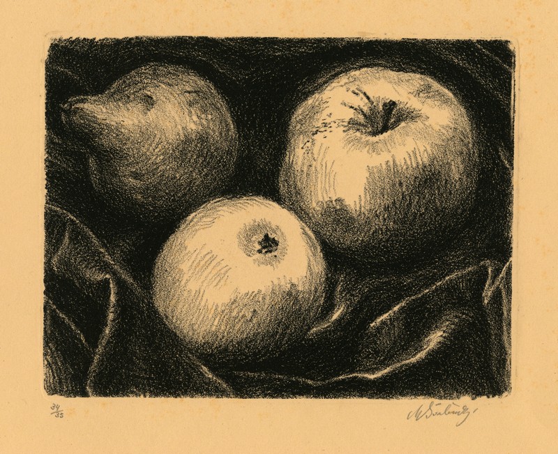 Popis: „Uprostřed a v pravém horním rohu listu po jednom velikém, dobře uzrálém, světlém jablku. V levém horním rohu hruška. Tyto tři kulaté hmoty leží na tmavém rozřaseném aksamitu. Kresleno z nadhledu.“ [Matějček 1933]