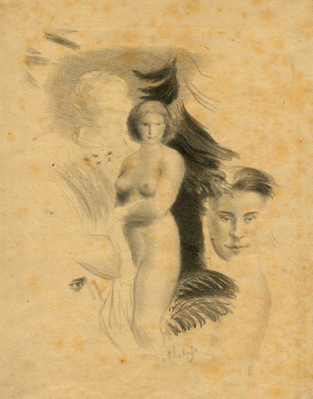 Popis: Skizza ženského aktu en face, ruce a nohy jsou nedokončeny. V pozadí nalevo jsou veliká oblaka, napravo jsou naznačeny tmavé větve jehličnatého stromu. Napravo opakovaná skizza obličeje, vlasy a tvář nedokončeny, nalevo studie oka, nad ní lehce kreslené opakování.“ [Palkovský 1923]